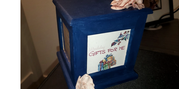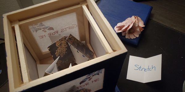 We made our own wedding decor to indicate table numbers for our wedding guests. After 4 years sitting in storage, I've repurposed two of them to contain a "raffle" of gifts to myself. One box is for weekday gifts—quick things like stretching, journaling, meditating, and giving myself a high five. The other box is for weekend gifts—longer form things like eating out by myself, taking a long walk with my dog, and going to a salt-water float tank.