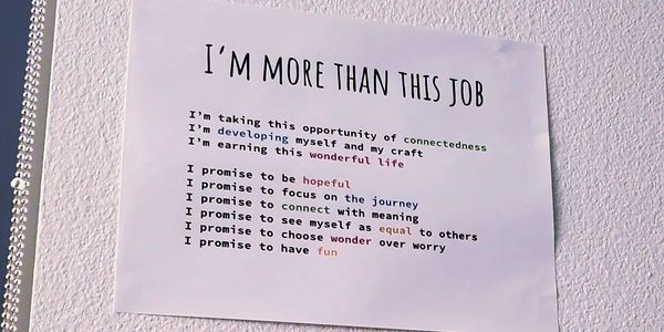 What's a quick, meaningful phrase to get you out of a work-only rut? Mine is "I'm more than this job," stated as a reminder that my success and failure in my workday does not define me, and that there is a "me" outside of work that I can hold as a foundation. The signage pictured here has other helpful reminders, like taking focus away from outcomes and setbacks, and refocusing on the journey and what's in the present moment.